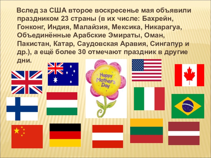 Слайд 10 Вслед за США второе воскресенье мая объявили праздником 23