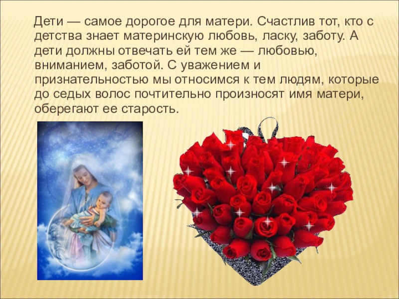 с детства знает материнскую любовь, ласку, заботу. А дети должны отвечать ей тем же — любовью, вниманием, заботой. С уважением и признательностью мы относимся к тем людям, которые до седых волос почтительно произносят имя матери, оберегают ее старость.