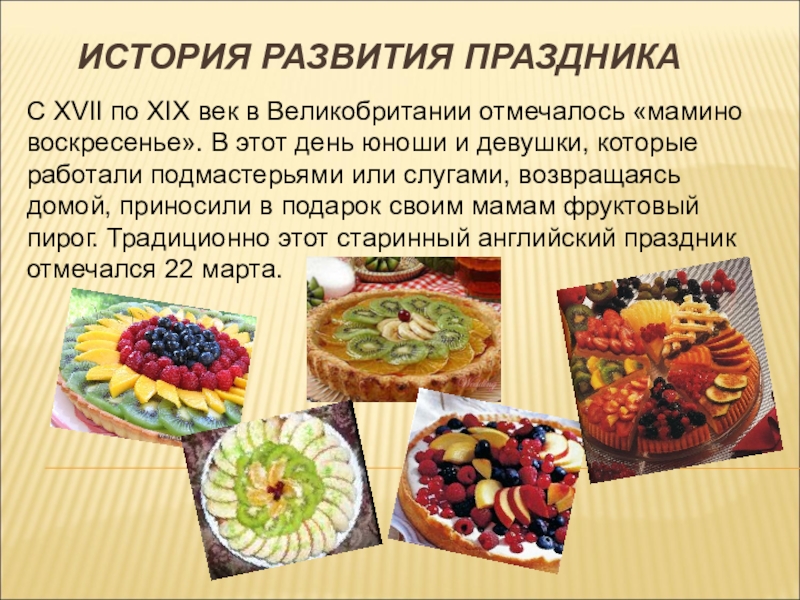 воскресенье». В этот день юноши и девушки, которые работали подмастерьями или слугами, возвращаясь домой, приносили в подарок своим мамам фруктовый пирог. Традиционно этот старинный английский праздник отмечался 22 марта.