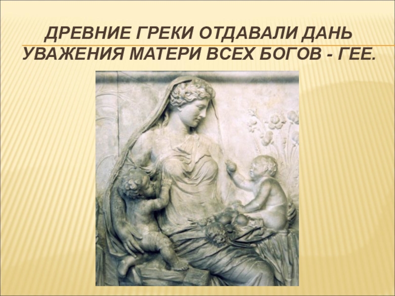 Слайд 4ДРЕВНИЕ ГРЕКИ ОТДАВАЛИ ДАНЬ УВАЖЕНИЯ МАТЕРИ ВСЕХ БОГОВ - ГЕЕ.