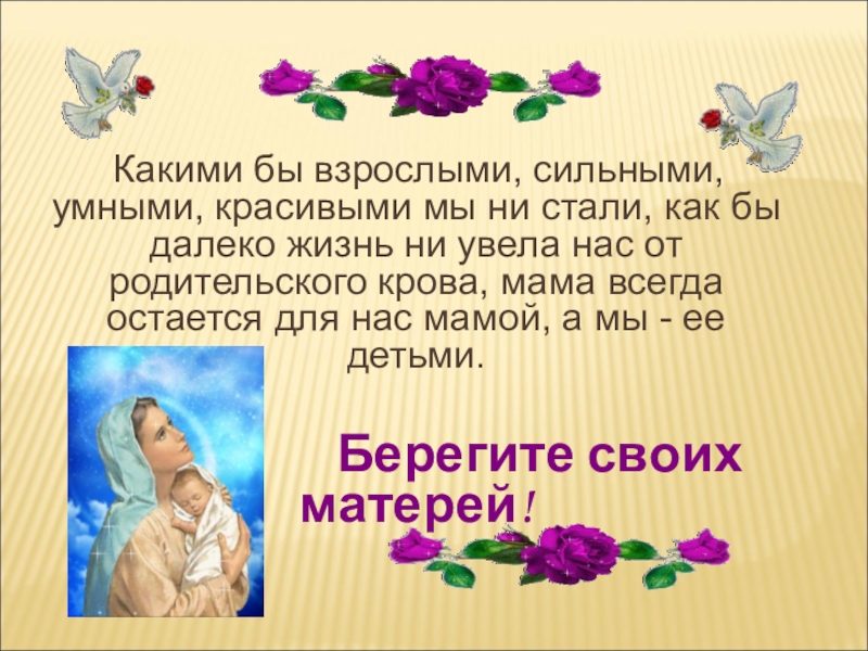 Слайд 18На свете не существует человека роднее и ближе матери. Ее любовь