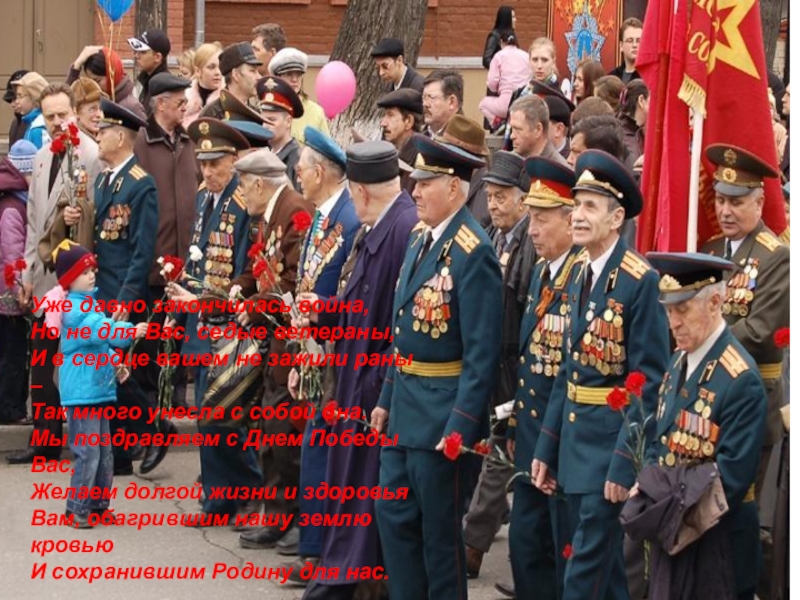 Уже давно закончилась война,Но не для Вас, седые ветераны,И в сердце вашем не зажили раны – Так