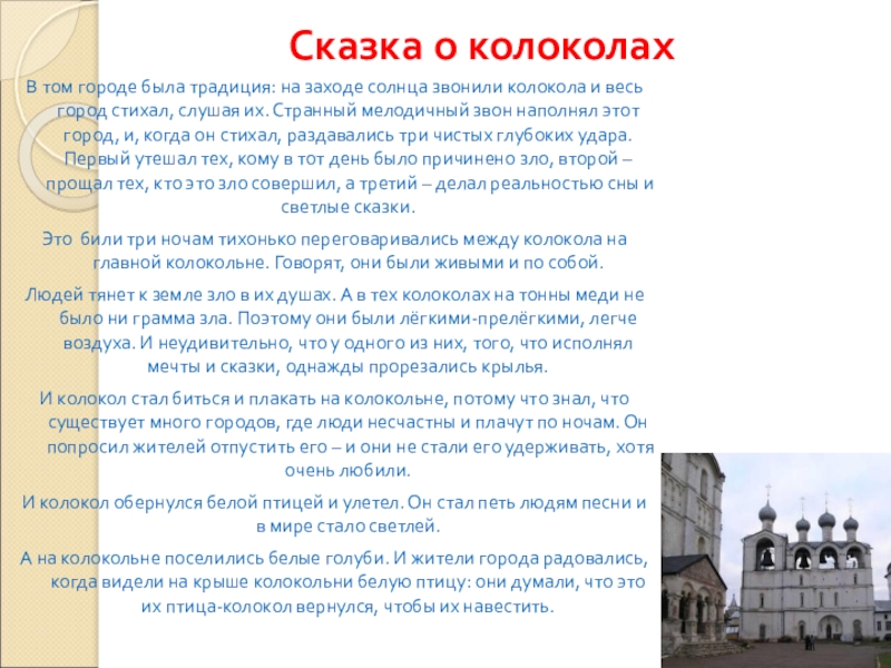 И колокол обернулся белой птицей и улетел. Он стал петь людям песни и в мире стало светлей.
