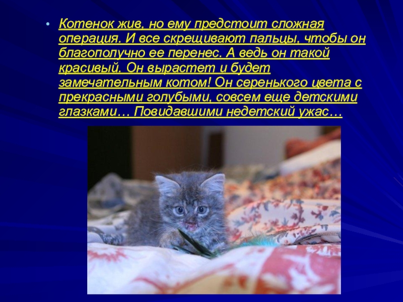 Слайд 16Котенок жив, но ему предстоит сложная операция. И все скрещивают пальцы,