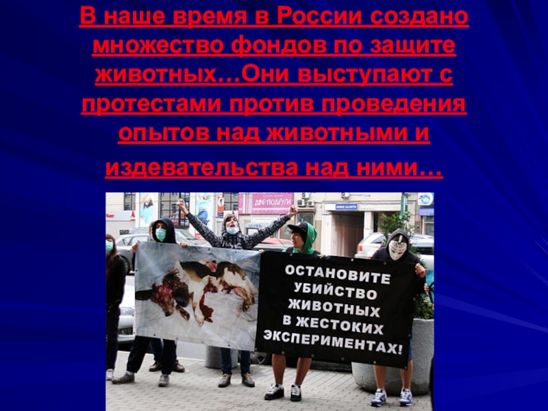 выступают с протестами против проведения опытов над животными и издевательства над ними…