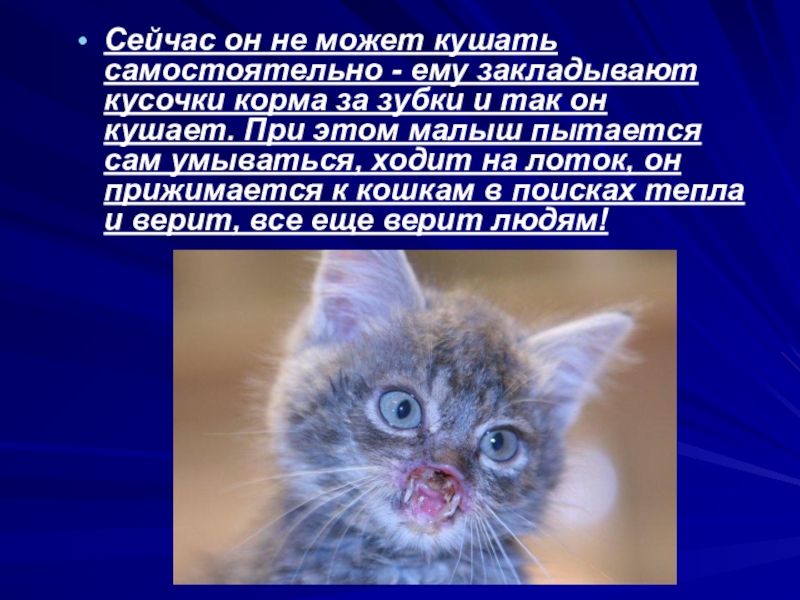 за зубки и так он кушает. При этом малыш пытается сам умываться, ходит на лоток, он прижимается к кошкам в поисках тепла и верит, все еще верит людям!