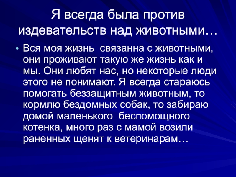 животными, они проживают такую же жизнь как и мы. Они любят нас, но некоторые люди этого не понимают. Я всегда стараюсь помогать беззащитным животным, то кормлю бездомных собак, то забираю домой маленького беспомощного котенка, много раз с мамой возили раненных щенят к ветеринарам…