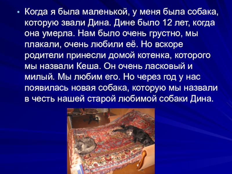 Дине было 12 лет, когда она умерла. Нам было очень грустно, мы плакали, очень любили её. Но вскоре родители принесли домой котенка, которого мы назвали Кеша. Он очень ласковый и милый. Мы любим его. Но через год у нас появилась новая собака, которую мы назвали в честь нашей старой любимой собаки Дина.