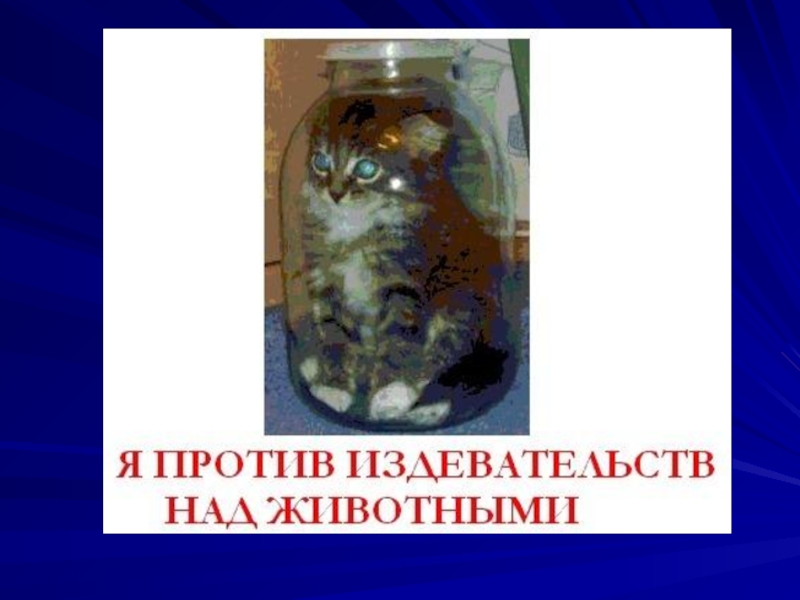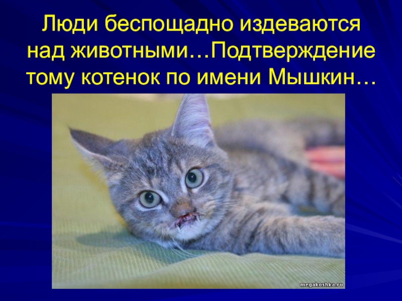 Слайд 12Люди беспощадно издеваются над животными…Подтверждение тому котенок по имени Мышкин…