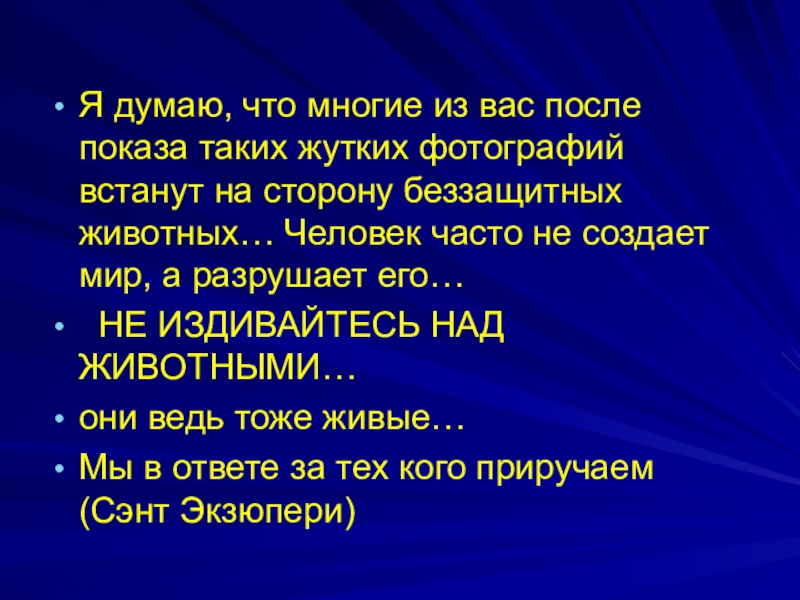 встанут на сторону беззащитных животных… Человек часто не создает мир, а разрушает его…