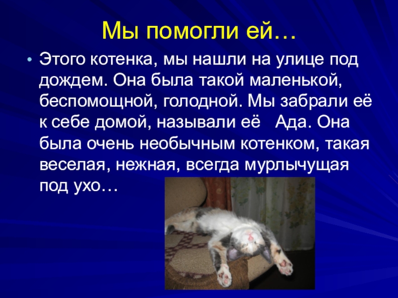 была такой маленькой, беспомощной, голодной. Мы забрали её к себе домой, называли её Ада. Она была очень необычным котенком, такая веселая, нежная, всегда мурлычущая под ухо…