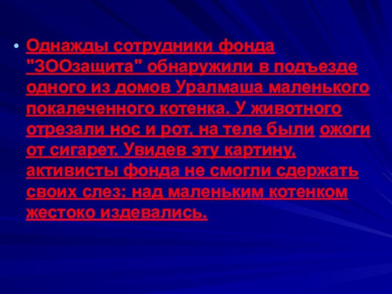 маленького покалеченного котенка. У животного отрезали нос и рот, на теле были ожоги от сигарет. Увидев эту картину, активисты фонда не смогли сдержать своих слез: над маленьким котенком жестоко издевались.