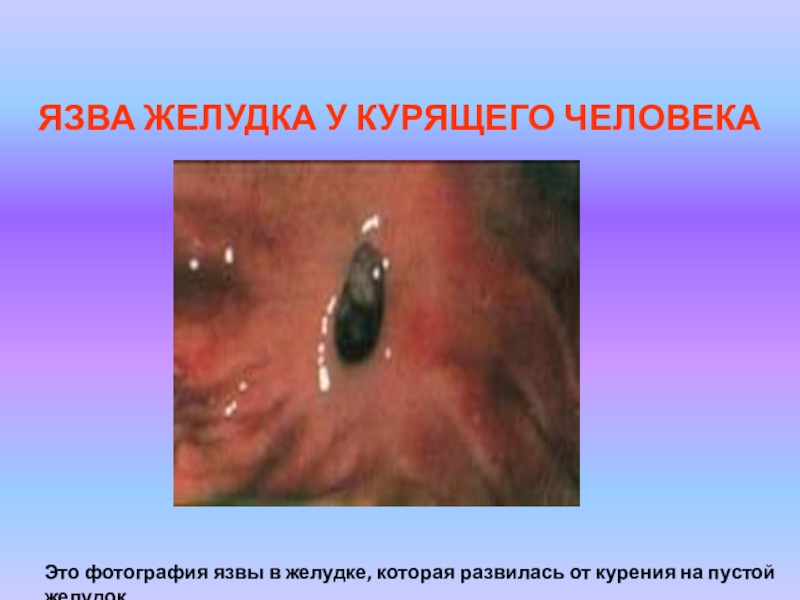 Слайд 10ЯЗВА ЖЕЛУДКА У КУРЯЩЕГО ЧЕЛОВЕКА
