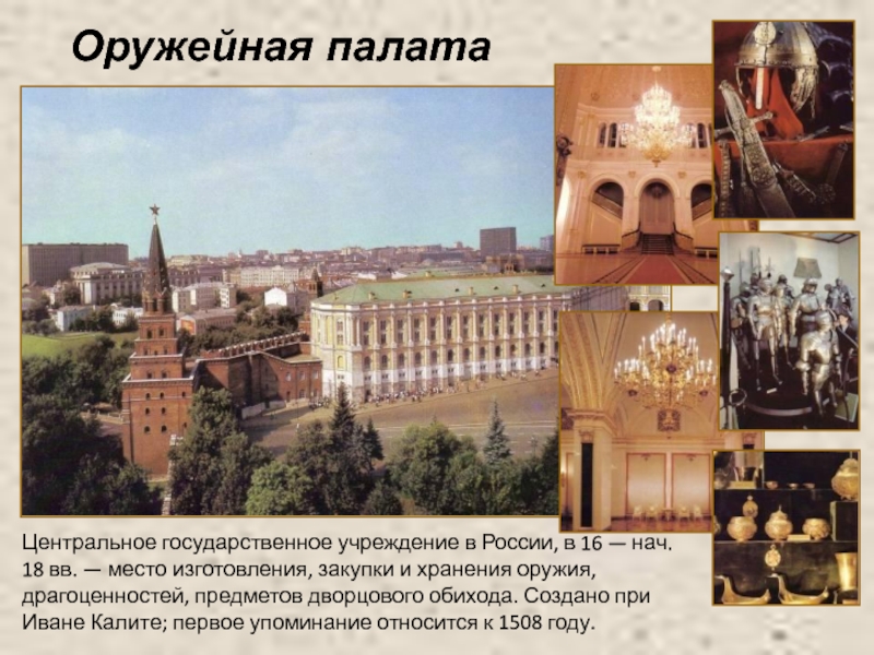 вв. — место изготовления, закупки и хранения оружия, драгоценностей, предметов дворцового обихода. Создано при Иване Калите; первое упоминание относится к 1508 году.
