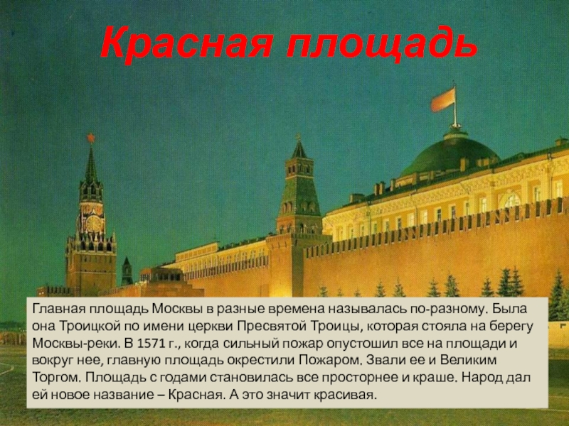 Троицкой по имени церкви Пресвятой Троицы, которая стояла на берегу Москвы-реки. В 1571 г., когда сильный пожар опустошил все на площади и вокруг нее, главную площадь окрестили Пожаром. Звали ее и Великим Торгом. Площадь с годами становилась все просторнее и краше. Народ дал ей новое название – Красная. А это значит красивая.