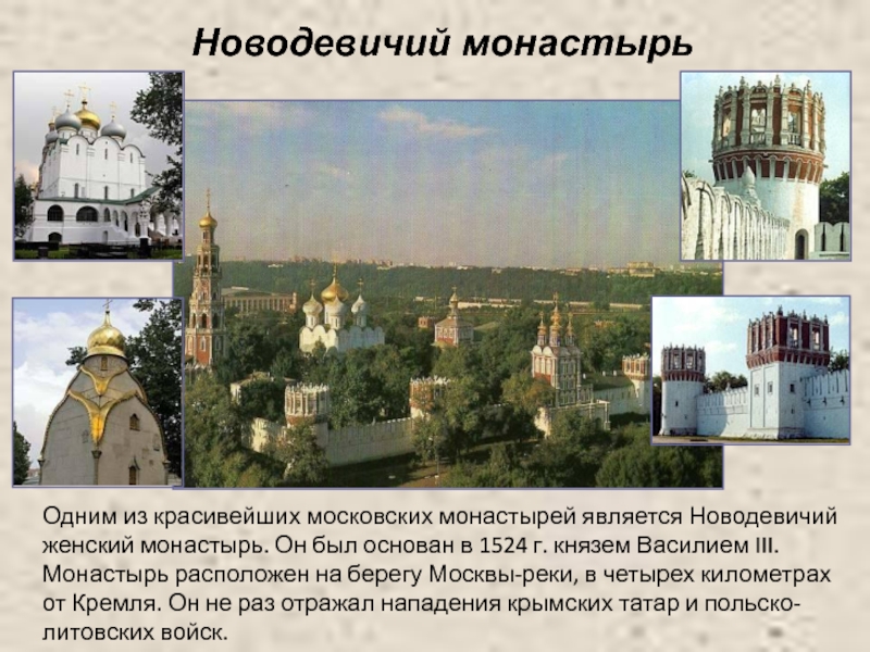 был основан в 1524 г. князем Василием III. Монастырь расположен на берегу Москвы-реки, в четырех километрах от Кремля. Он не раз отражал нападения крымских татар и польско-литовских войск.