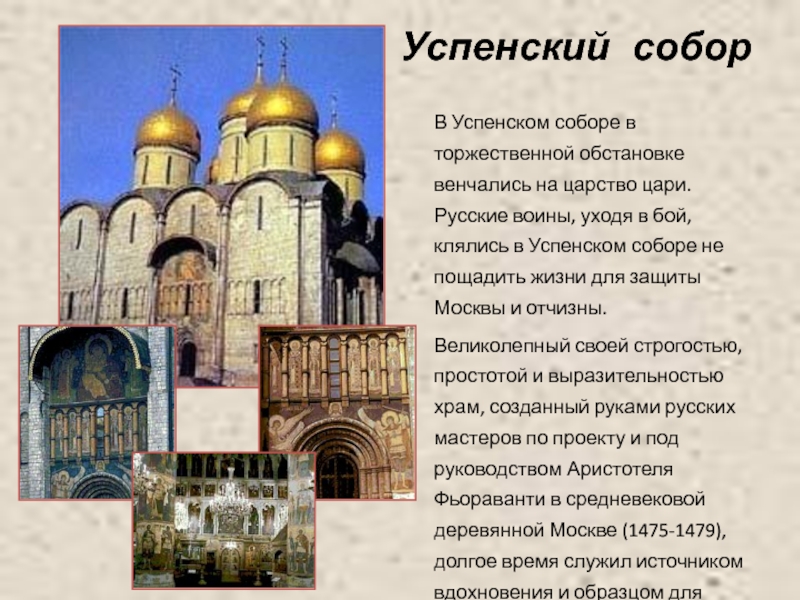 Великолепный своей строгостью, простотой и выразительностью храм, созданный руками русских мастеров по проекту и под руководством Аристотеля Фьораванти в средневековой деревянной Москве (1475-1479), долгое время служил источником вдохновения и образцом для многочисленных подражаний.