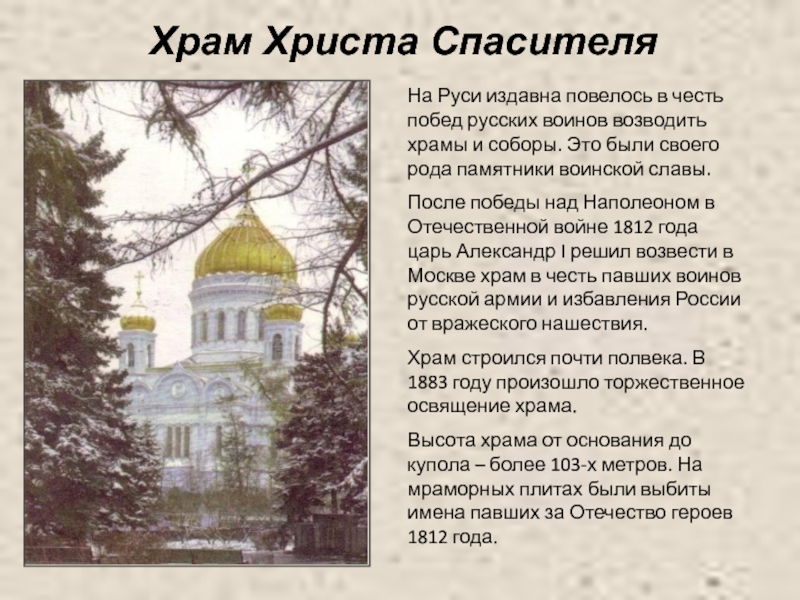 После победы над Наполеоном в Отечественной войне 1812 года царь Александр I решил возвести в Москве храм в честь павших воинов русской армии и избавления России от вражеского нашествия.