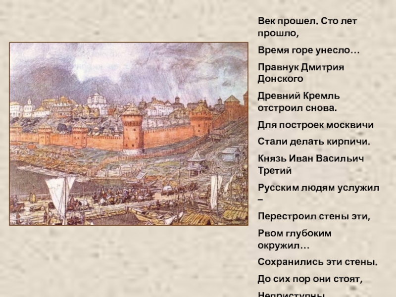 конце XV века при великом московском князе Иване III, смелом, волевом и решительном человеке. Он заботился о том, чтобы стольный град был надежно укреплен и чтобы выглядел торжественным, величавым, «красно украшенным».