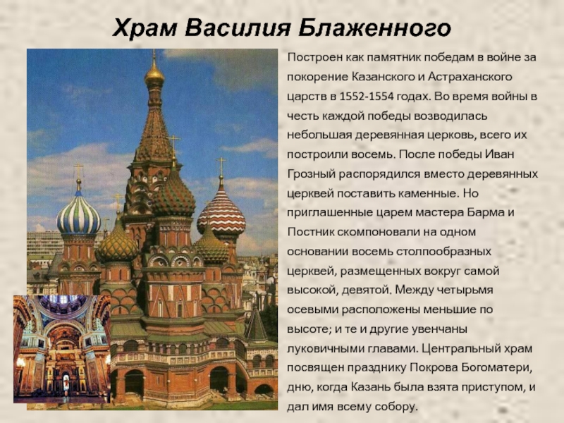 и Астраханского царств в 1552-1554 годах. Во время войны в честь каждой победы возводилась небольшая деревянная церковь, всего их построили восемь. После победы Иван Грозный распорядился вместо деревянных церквей поставить каменные. Но приглашенные царем мастера Барма и Постник скомпоновали на одном основании восемь столпообразных церквей, размещенных вокруг самой высокой, девятой. Между четырьмя осевыми расположены меньшие по высоте; и те и другие увенчаны луковичными главами. Центральный храм посвящен празднику Покрова Богоматери, дню, когда Казань была взята приступом, и дал имя всему собору.