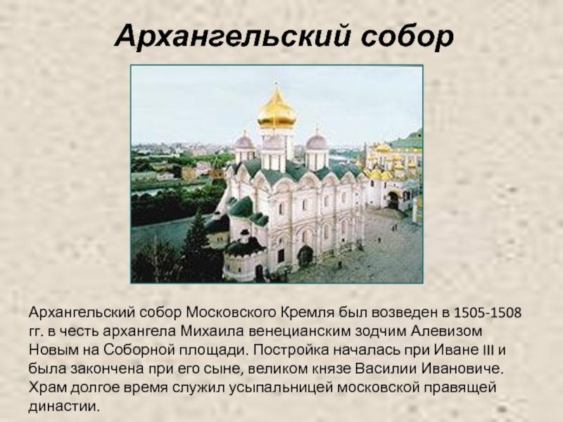 честь архангела Михаила венецианским зодчим Алевизом Новым на Соборной площади. Постройка началась при Иване III и была закончена при его сыне, великом князе Василии Ивановиче. Храм долгое время служил усыпальницей московской правящей династии.
