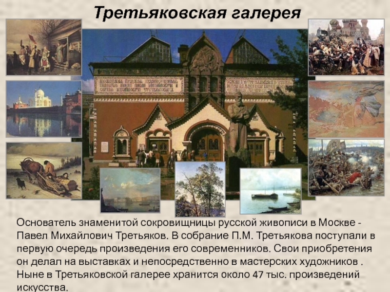 Третьяков. В собрание П.М. Третьякова поступали в первую очередь произведения его современников. Свои приобретения он делал на выставках и непосредственно в мастерских художников . Ныне в Третьяковской галерее хранится около 47 тыс. произведений искусства.