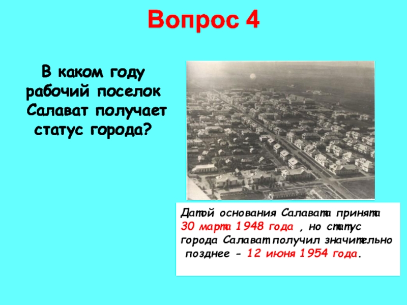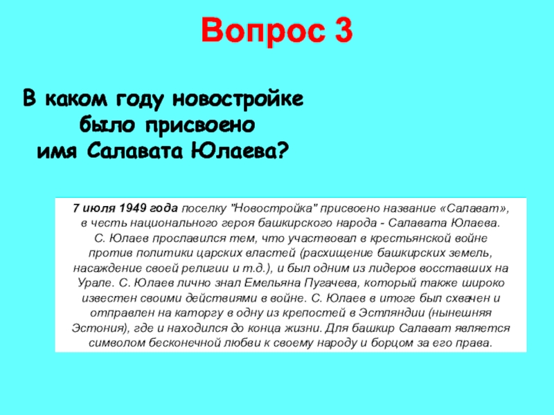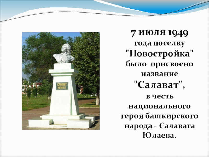 Слайд 137 июля 1949 года поселку "Новостройка" было присвоено название "Салават",