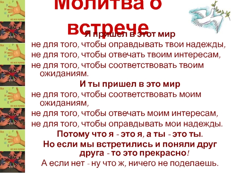 Молитва о встречеЯ пришел в этот мир не для того, чтобы оправдывать твои надежды,не для того, чтобы