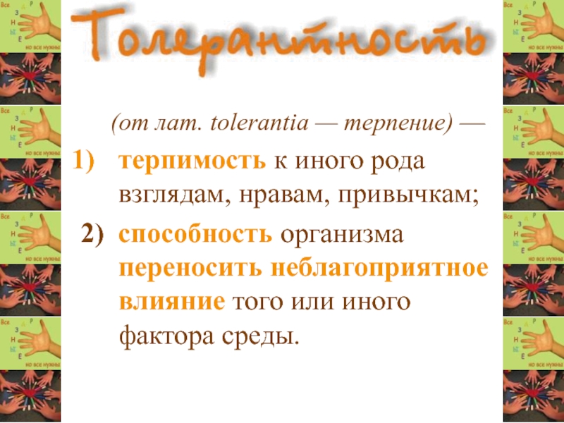 (от лат. tolerantia — терпение) — терпимость к иного рода взглядам, нравам, привычкам; 2) способность организма переносить неблагоприятное влияние того или иного фактора среды.