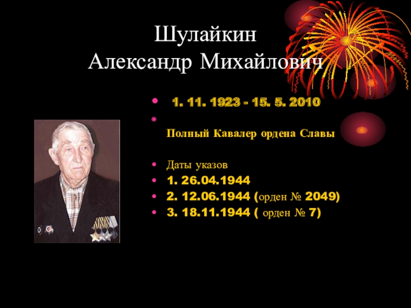 Шулайкин  Александр Михайлович 1. 11. 1923 - 15. 5. 2010 Полный Кавалер ордена СлавыДаты указов1. 26.04.19442.