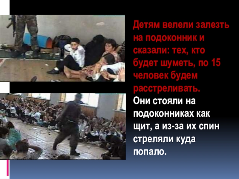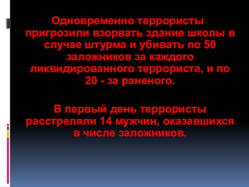 Слайд 6 Одновременно террористы пригрозили взорвать здание школы в случае штурма и