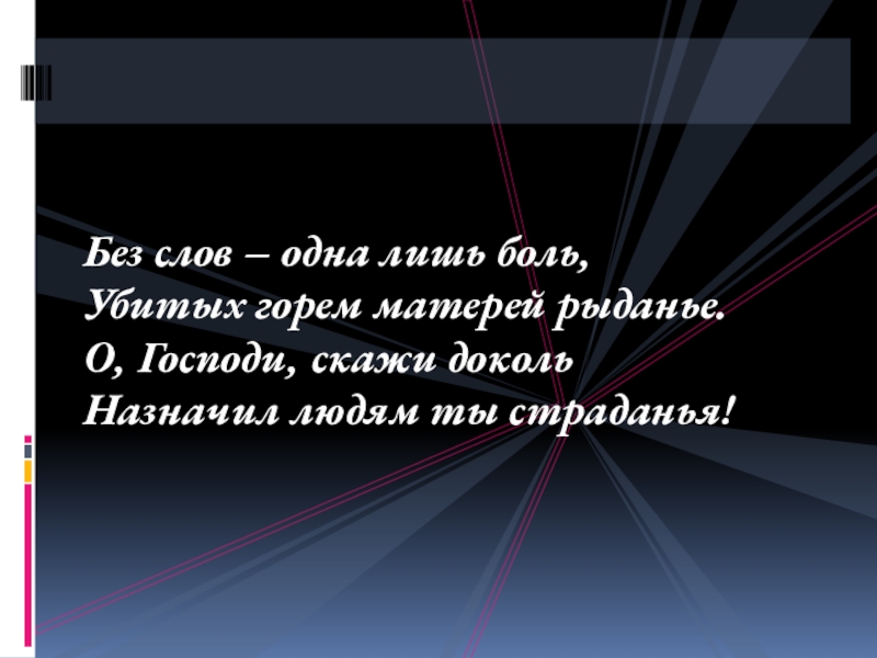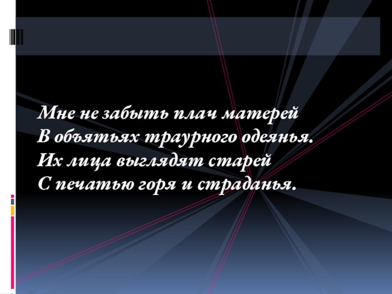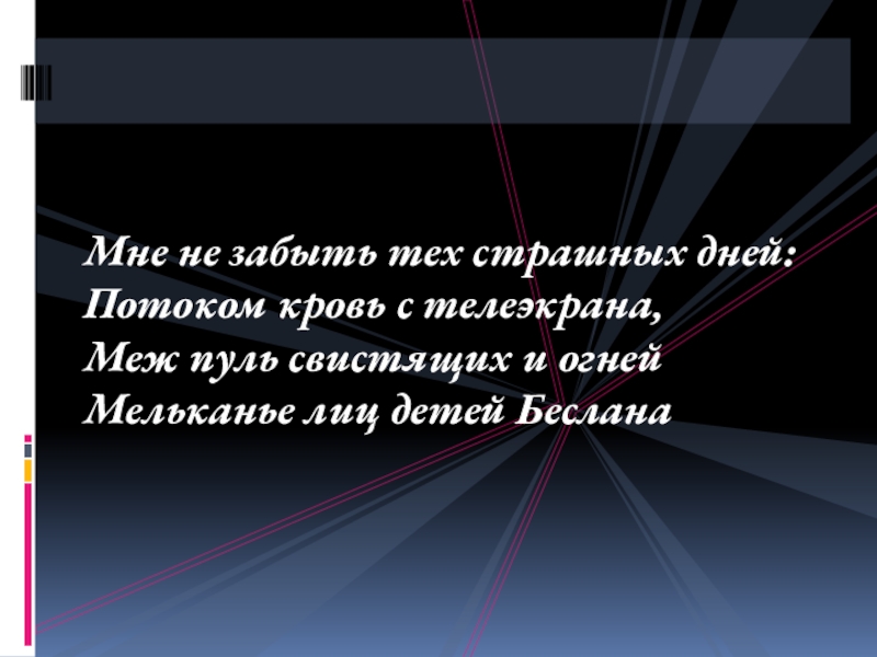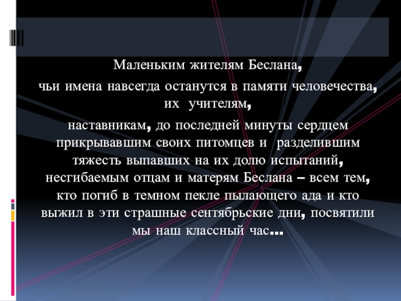 до последней минуты сердцем прикрывавшим своих питомцев и разделившим тяжесть выпавших на их долю испытаний, несгибаемым отцам и матерям Беслана – всем тем, кто погиб в темном пекле пылающего ада и кто выжил в эти страшные сентябрьские дни, посвятили мы наш классный час…