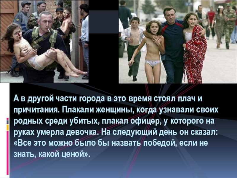 причитания. Плакали женщины, когда узнавали своих родных среди убитых, плакал офицер, у которого на руках умерла девочка. На следующий день он сказал: «Все это можно было бы назвать победой, если не знать, какой ценой».