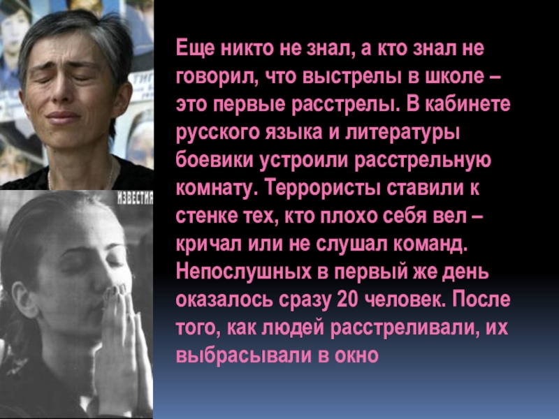 в школе – это первые расстрелы. В кабинете русского языка и литературы боевики устроили расстрельную комнату. Террористы ставили к стенке тех, кто плохо себя вел – кричал или не слушал команд. Непослушных в первый же день оказалось сразу 20 человек. После того, как людей расстреливали, их выбрасывали в окно