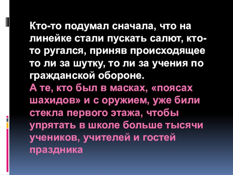 А те, кто был в масках, «поясах шахидов» и с оружием, уже били стекла первого этажа, чтобы упрятать в школе больше тысячи учеников, учителей и гостей праздника