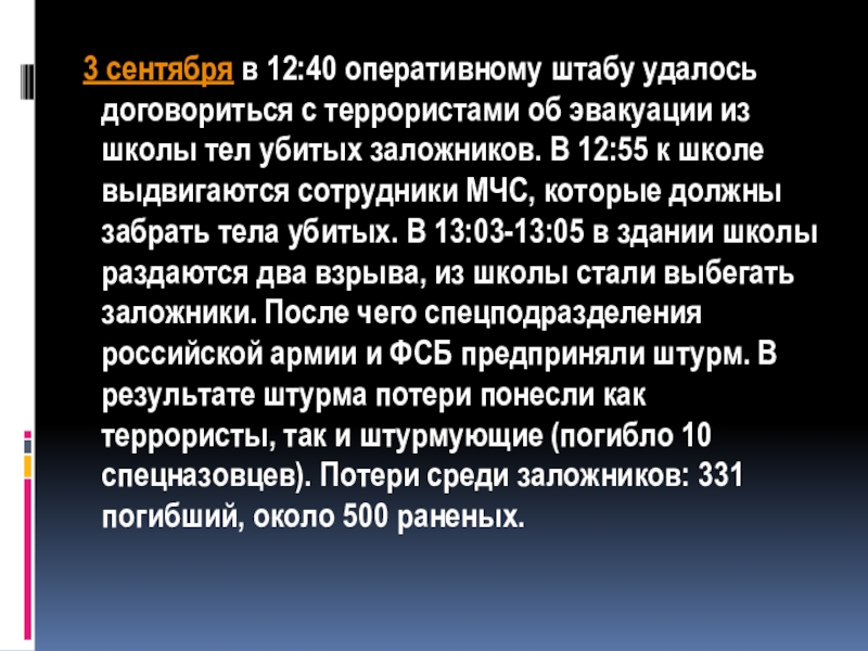 об эвакуации из школы тел убитых заложников. В 12:55 к школе выдвигаются сотрудники МЧС, которые должны забрать тела убитых. В 13:03-13:05 в здании школы раздаются два взрыва, из школы стали выбегать заложники. После чего спецподразделения российской армии и ФСБ предприняли штурм. В результате штурма потери понесли как террористы, так и штурмующие (погибло 10 спецназовцев). Потери среди заложников: 331 погибший, около 500 раненых.
