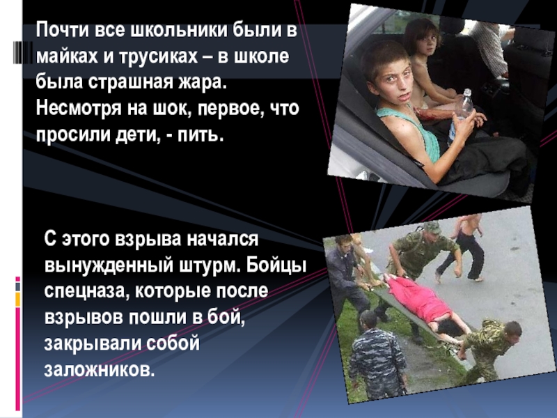 С этого взрыва начался вынужденный штурм. Бойцы спецназа, которые после взрывов пошли в бой, закрывали собой заложников.
