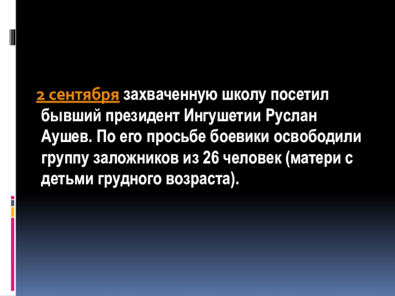Ингушетии Руслан Аушев. По его просьбе боевики освободили группу заложников из 26 человек (матери с детьми грудного возраста).