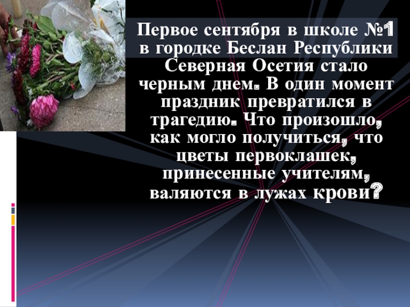 стало черным днем. В один момент праздник превратился в трагедию. Что произошло, как могло получиться, что цветы первоклашек, принесенные учителям, валяются в лужах крови?