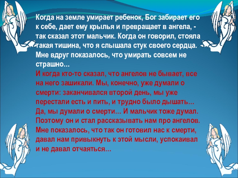 Поэтому он и стал рассказывать нам про ангелов. Мне показалось, что так он готовил нас к смерти, давал нам привыкнуть к этой мысли, успокаивал и не давал отчаяться…