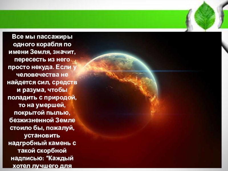 Все мы пассажиры одного корабля по имени Земля, значит, пересесть из него просто некуда. Если у человечества