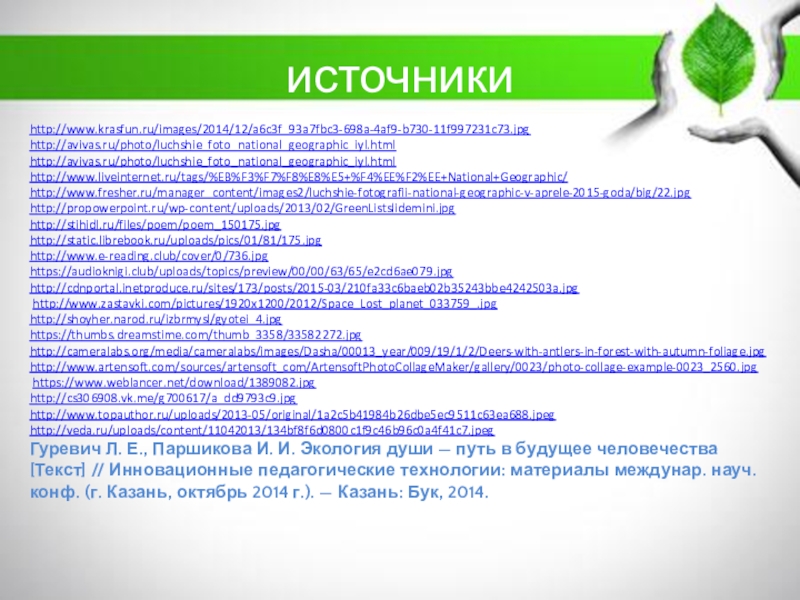 Гуревич Л. Е., Паршикова И. И. Экология души — путь в будущее человечества [Текст] // Инновационные педагогические технологии: материалы междунар. науч. конф. (г. Казань, октябрь 2014 г.). — Казань: Бук, 2014.