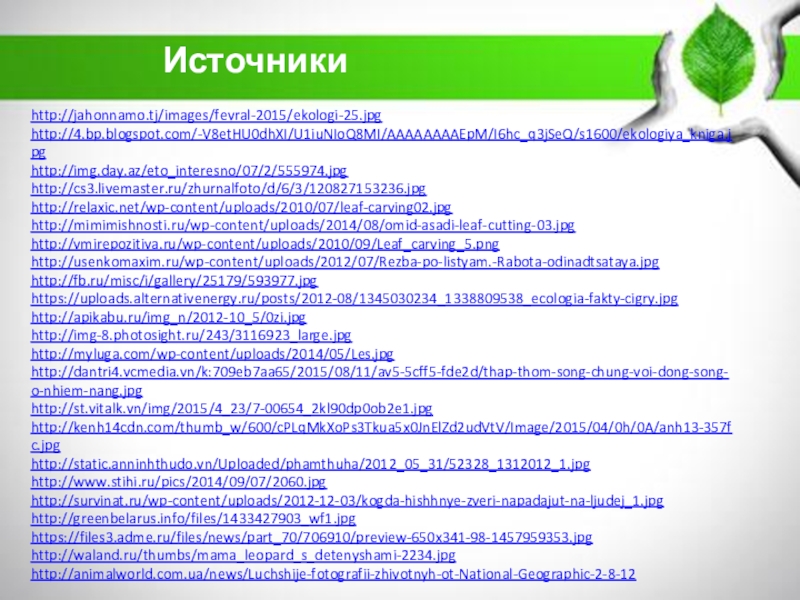 Источникиhttp://jahonnamo.tj/images/fevral-2015/ekologi-25.jpg http://4.bp.blogspot.com/-V8etHU0dhXI/U1iuNIoQ8MI/AAAAAAAAEpM/I6hc_q3jSeQ/s1600/ekologiya_kniga.jpg http://img.day.az/eto_interesno/07/2/555974.jpg http://cs3.livemaster.ru/zhurnalfoto/d/6/3/120827153236.jpg http://relaxic.net/wp-content/uploads/2010/07/leaf-carving02.jpg http://mimimishnosti.ru/wp-content/uploads/2014/08/omid-asadi-leaf-cutting-03.jpg http://vmirepozitiva.ru/wp-content/uploads/2010/09/Leaf_carving_5.png http://usenkomaxim.ru/wp-content/uploads/2012/07/Rezba-po-listyam.-Rabota-odinadtsataya.jpg http://fb.ru/misc/i/gallery/25179/593977.jpg https://uploads.alternativenergy.ru/posts/2012-08/1345030234_1338809538_ecologia-fakty-cigry.jpg http://apikabu.ru/img_n/2012-10_5/0zi.jpg http://img-8.photosight.ru/243/3116923_large.jpg http://myluga.com/wp-content/uploads/2014/05/Les.jpg http://dantri4.vcmedia.vn/k:709eb7aa65/2015/08/11/av5-5cff5-fde2d/thap-thom-song-chung-voi-dong-song-o-nhiem-nang.jpg http://st.vitalk.vn/img/2015/4_23/7-00654_2kl90dp0ob2e1.jpg http://kenh14cdn.com/thumb_w/600/cPLqMkXoPs3Tkua5x0JnElZd2udVtV/Image/2015/04/0h/0A/anh13-357fc.jpg http://static.anninhthudo.vn/Uploaded/phamthuha/2012_05_31/52328_1312012_1.jpg