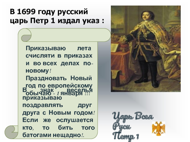 В знак веселья приказываю поздравлять друг друга с Новым годом! Если же ослушается кто, то бить того батогами нещадно!.