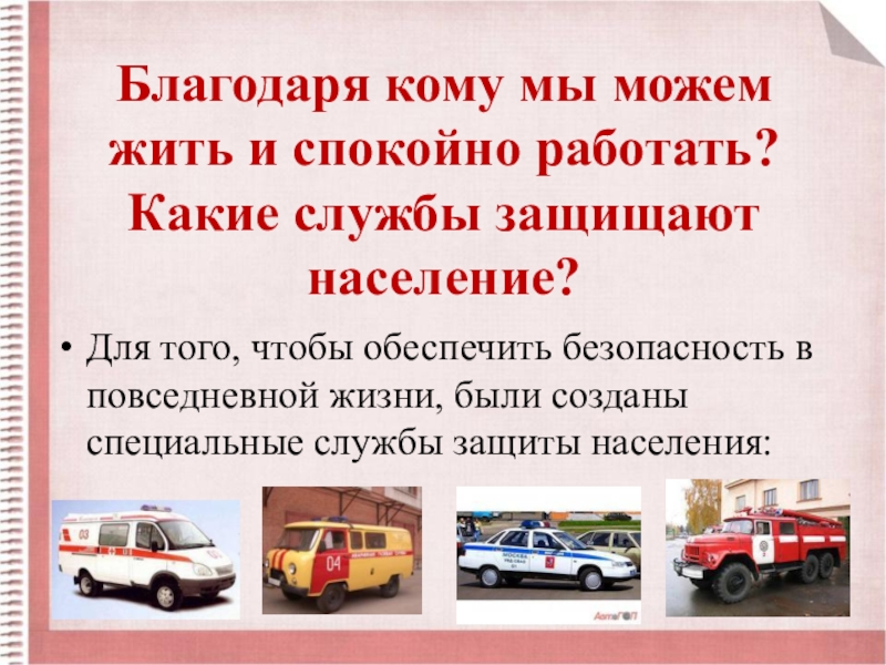 Для того, чтобы обеспечить безопасность в повседневной жизни, были созданы специальные службы защиты населения: