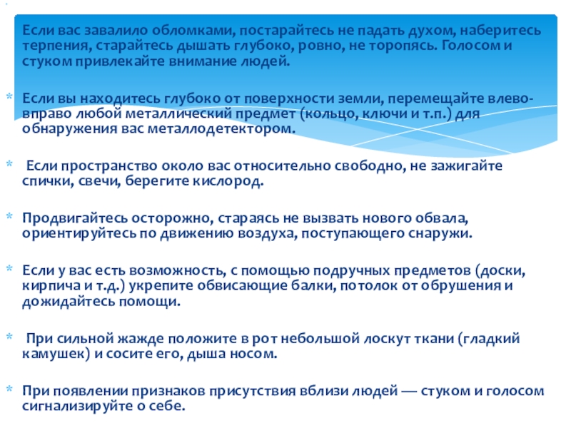 9. Не сообщать об угрозе взрыва никому, кроме тех, кому необходимо знать о случившемся, чтобы не создавать панику.