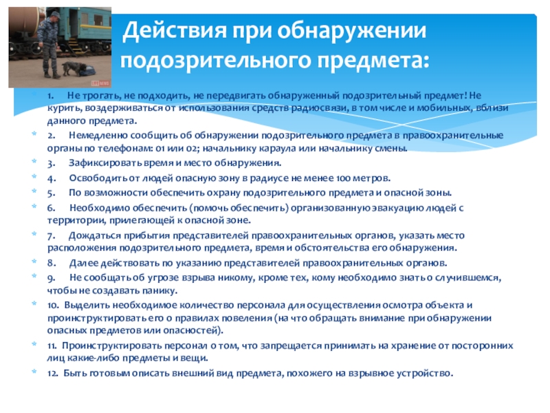 12. Быть готовым описать внешний вид предмета, похожего на взрывное устройство.