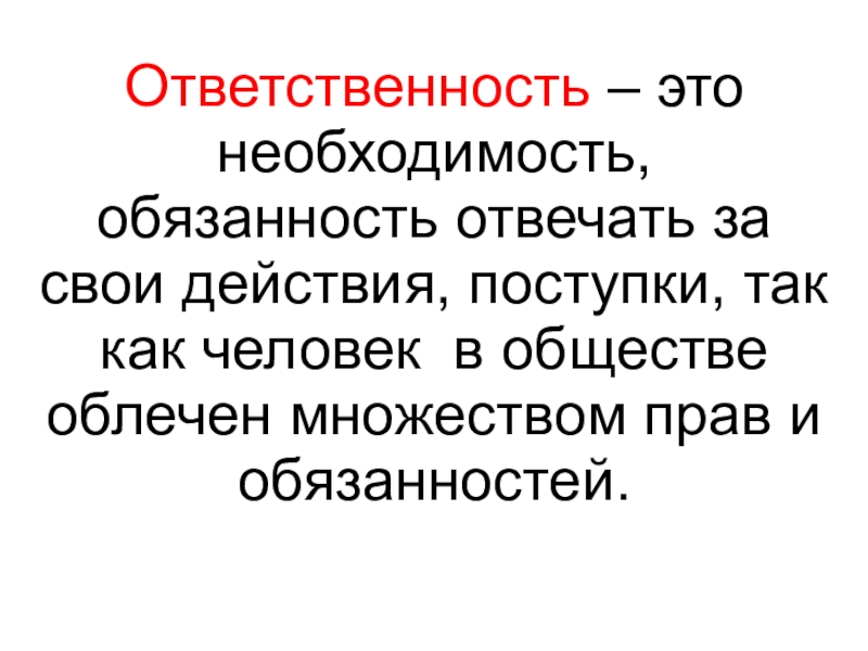 Слайд 4Ответственность – это необходимость, обязанность отвечать за свои действия, поступки, так