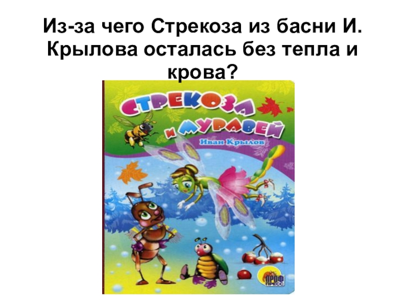 Слайд 9 Из-за чего Стрекоза из басни И.Крылова осталась без тепла и крова?