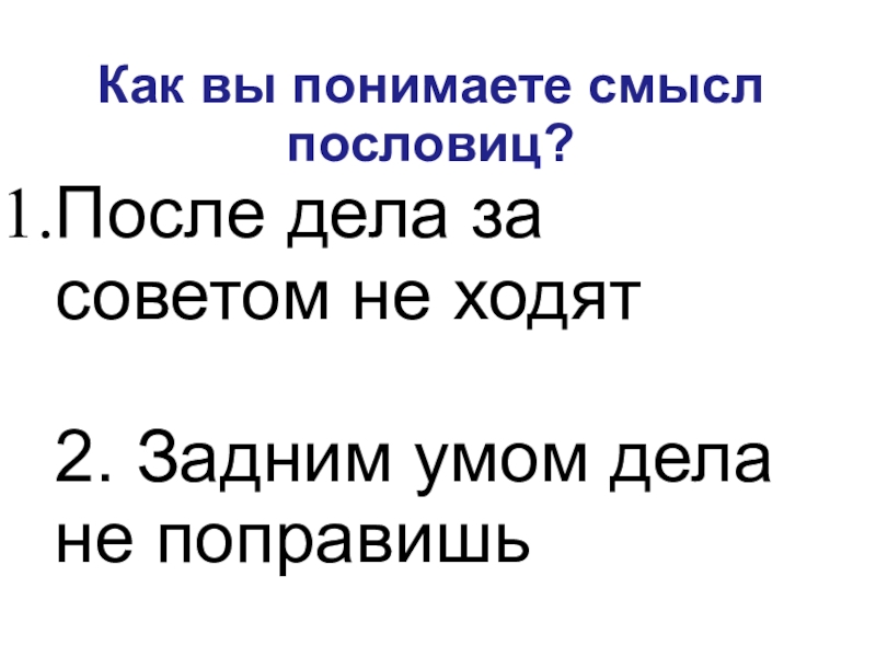 Как вы понимаете смысл пословиц?После дела за советом не ходят2. Задним умом дела не поправишь